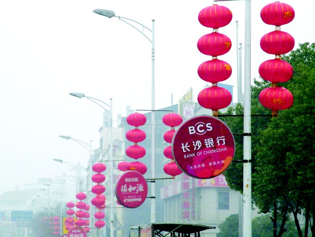 白马广场的十字路口,现在由于春运已经开始,车流量和人流量都非常的多,十分的热闹,大而且道路两旁已经挂满了大红灯笼,洋溢着过年的气氛。在县城的各个街道,都可以看到一排排写着“恭喜发财”、“新春愉快”等字样的红灯笼都整齐悬挂着,每个灯杆上有8个,分成两串固定着。特别是在二环路、八一西路、人民路等路段还给树木装饰了彩灯。一条条街道在大红灯笼和彩灯的映衬下洋溢着节日的喜庆,也给城区增添了一道道亮丽的风景。在沿江风光带散步的市民张先生告诉笔者,现在这红灯笼一挂起来,过年的气氛就浓了,大家都觉得很兴奋。 熊胜兰