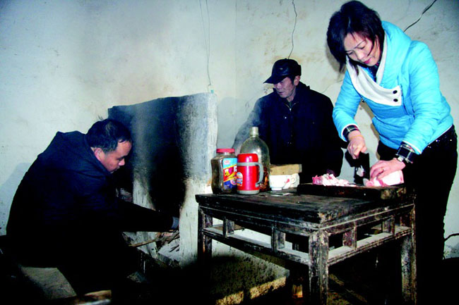 大家不及寒喧,即为和孤独的老王一起吃顿特殊的年夜饭忙乎起来。贺雪辉袖子一挽,亲自下厨,铁锅土灶炒菜做饭竟然轻车熟路;村书记李新民则坐到灶台前帮忙添柴烧火,很快就将灶膛烧得旺旺的;老王则上下张罗着准备锅碗瓢盆。一时间,原本冷冷清清的老王家,顿时炉红火旺、菜肴飘香,充满了欢声笑语。