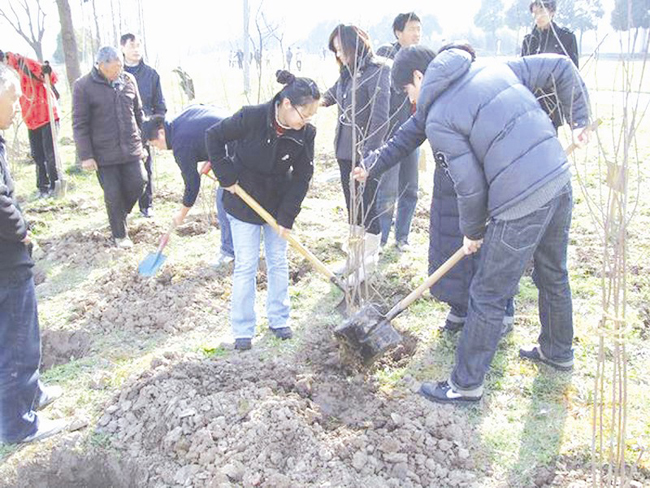 近日,南田坪乡计生办、计生协会组织宣传“增强环保绿化意识,关爱女孩造福后代”活动,并组织烟田村支村两委及计划生育家庭户到烟田村学校举行植树活动。半天的功夫,校园的空地上就栽满了树苗。图为植树现场。