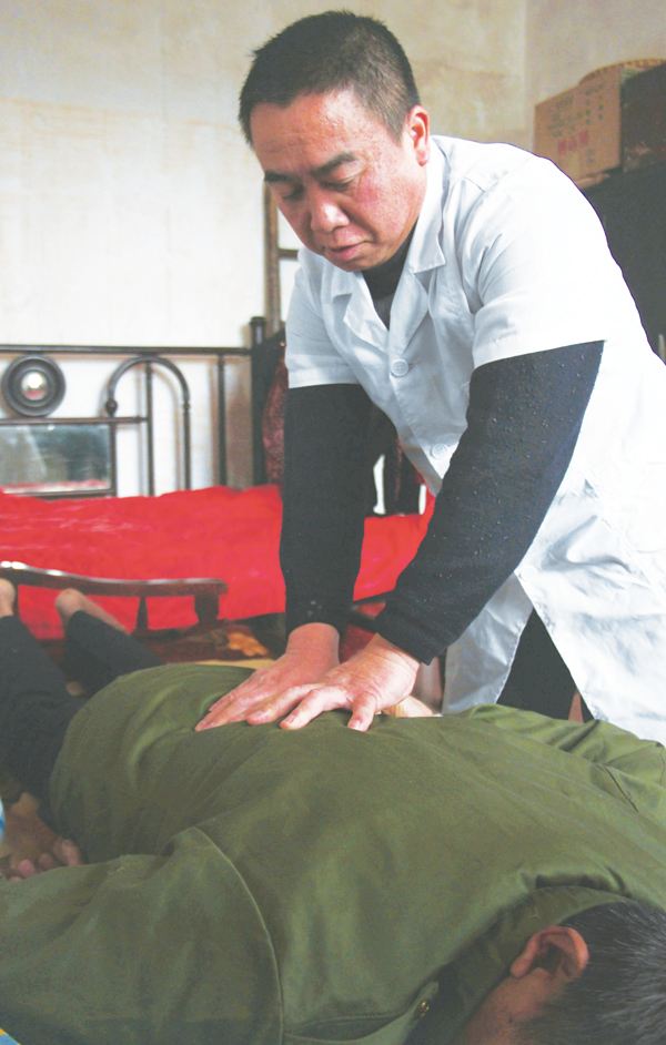 图为石国忠在为岳父曾月明做按摩理疗。