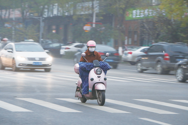 骑车的市民全副武装地赶着路,除了戴帽子、口罩,电动车也都披上了挡风被。