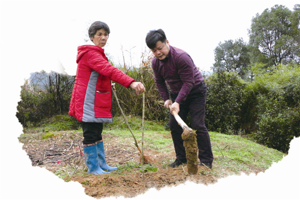胡跃波(右)将送到周小玲家的黄桃树种好。