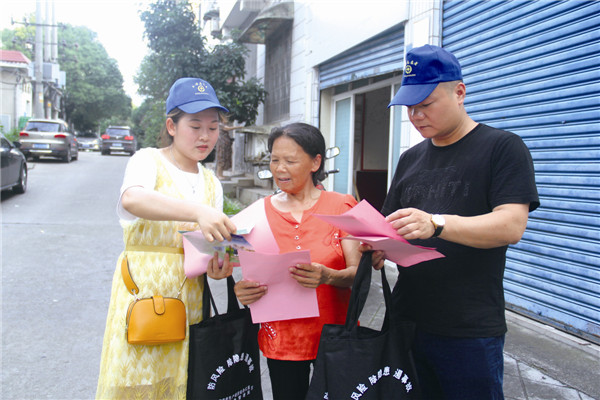 图为安全生产志愿者走进村(社区)向群众发放安全生产宣传单。