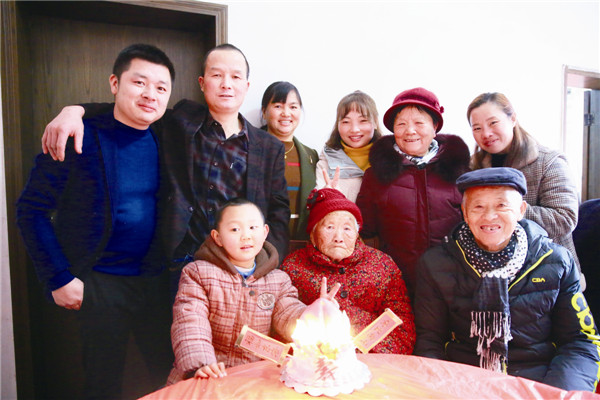 一大早,女儿们就给贺爱莲换上了崭新的衣服,后辈们从四面八方赶来,齐聚在老人身边。老人虽然已经百岁高寿,但精气神足,脸上肤色红润,气色极好,始终笑眯眯的。寿宴上,后辈们排着队依次给老人拜寿,送上生日蛋糕。看着这么多后辈为自己过生日,老人格外高兴。