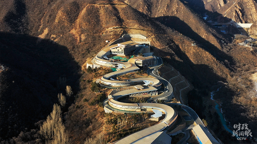 △国家雪车雪橇中心结合自然地形和遮阳设计,研发出一套独特的“地形气候保护系统”,能够有效保护赛道不受阳光、风雪影响。整条赛道宛如一条游龙,飞腾于山脊之上。(总台央视记者程铖拍摄)