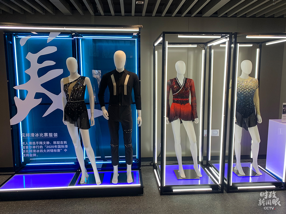 △左边是花样滑冰双人滑选手隋文静、韩聪的比赛服,两位选手在“2020年国际滑联花样滑冰四大洲锦标赛”中夺冠。(总台央视记者范一鸣拍摄)