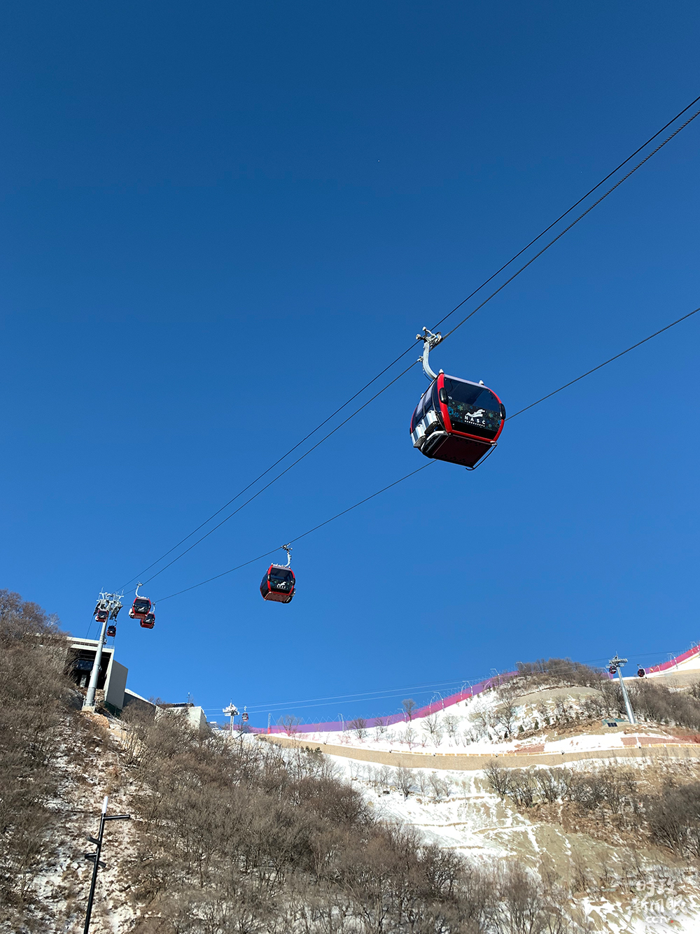 △索道系统由9条索道及2条牵引组成,全长10.3公里,赛时可确保运动员30分钟内从冬奥村抵达各项目出发点。(总台国广记者李晋、央视记者石丞拍摄)