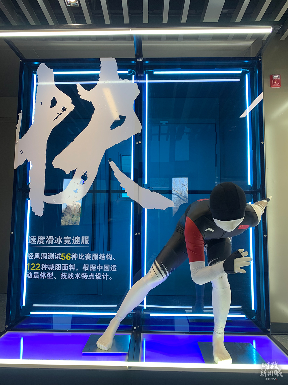△首都体育馆内展示了多款训练服,体现“快护暖美”的设计理念。这是速度滑冰竞速服,经风洞测试56种比赛服结构、122种减阻面料,根据中国运动员体型、技战术特点设计而成。(总台央视记者范一鸣拍摄)