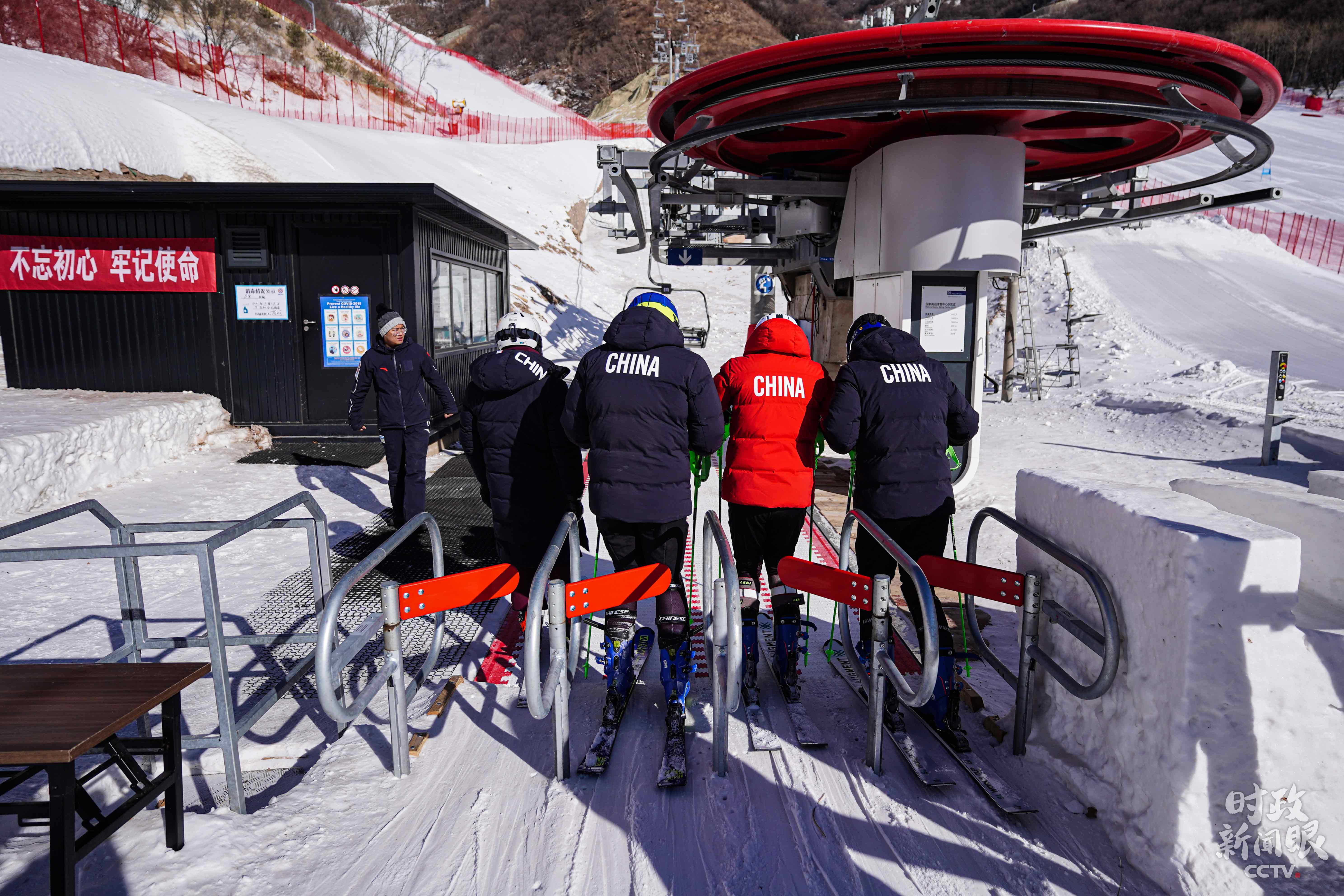 △国家高山滑雪队员准备搭乘缆车上训练赛道。(总台国广记者李晋拍摄)