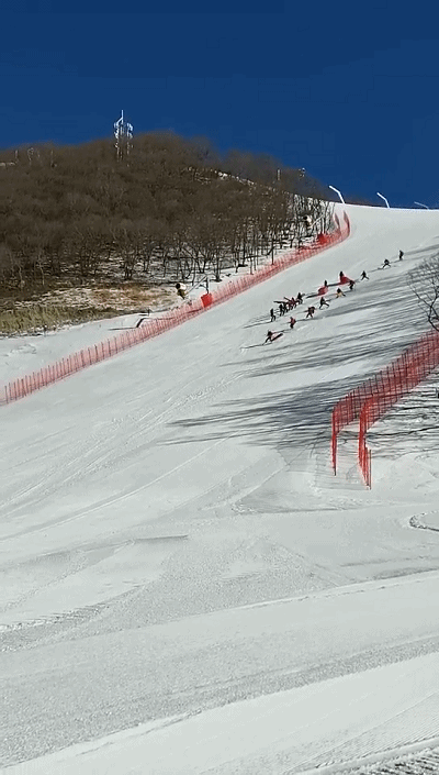 △中国高山滑雪队队员王基森在比赛地进行回转训练。(总台国广记者李晋拍摄)